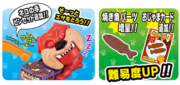 「看門狗GaoGao」,是一款多人同樂的派對玩具,玩家需要從睡覺的看門狗GaoGao 狗碗中偷出飼料,但震動、聲音太大吵醒看門狗GaoGao,就會讓GaoGao 發飆衝出來! 震撼的效果絕對嚇尿所有人~XD 最新版的「更加心驚膽跳!!看門狗GaoGao -貓手MIX-」(暫譯),保有了普通模式與先前升級版追加、更加敏感的「猛犬模式」。本次增加了更難拿取的烤魚零件數量,與更加考驗抓取技巧的貓爪夾子,讓難度更加大幅升級,即使是大人也會陷入苦戰~