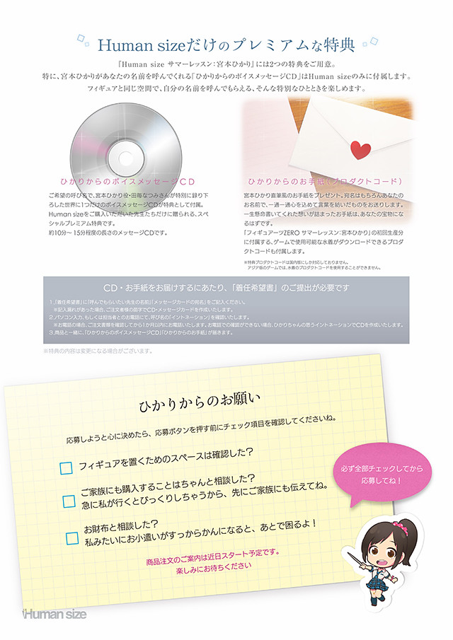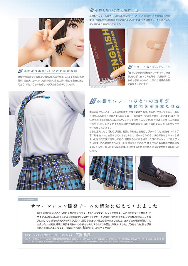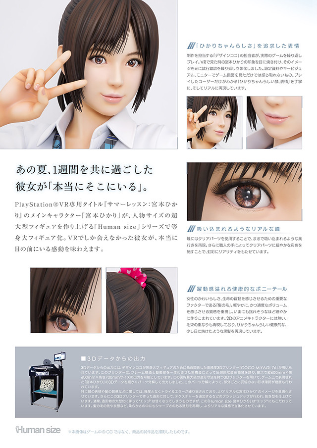 「Human size 夏日課程:宮本光」以遊戲中的人物模組為基礎,並運用DESIGN CO-CO(デザインココ)公司的獨自開發的高精度3D列印機「COCO MIYAGI 76」製作。原型師們在製作過程中也用PSVR進行了無數次《夏日課程》,為的就是要將玩家在遊戲中遇見的宮本光忠實再現,從五官、體型到動作都相當講究。