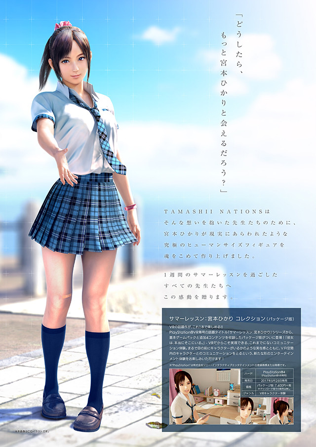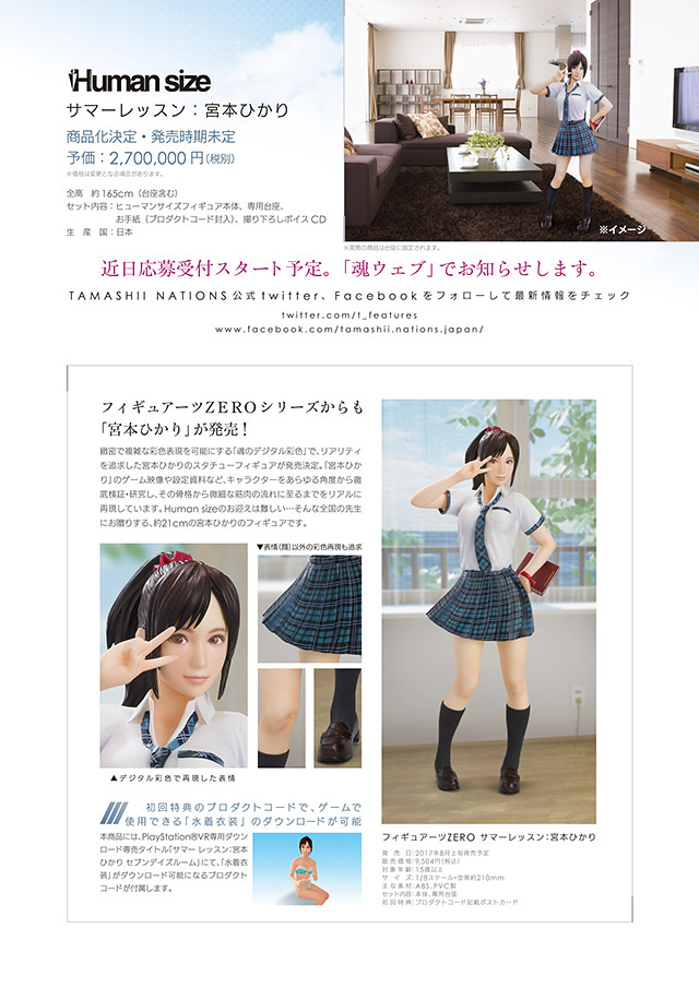 由日本BADNAI萬代玩具公司發行,運用精銳的3D列印技術,將細膩的造型與色彩以人類大小呈現的超大型模型品牌「Human size」繼第一彈的「哥吉拉 (1991北海道ver.)」後,日前再度發表了最新作品,來自話題性PSVR遊戲《夏日課程》的「Human size 夏日課程:宮本光」(Human size サマーレッスン:宮本ひかり)即將於近日開放登記預約的消息,發售日期未定。