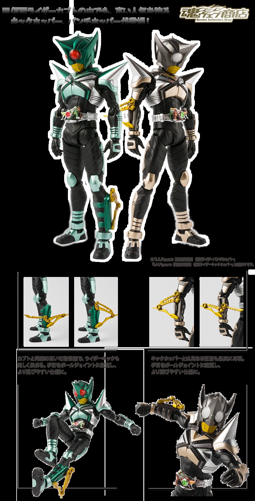 在系列劇集在第33話所登場的「假面騎士踢蝗」,適任者為"矢車 想"由於恨意與墮落的關係,矢車常以「真是羨慕你耶」的口頭禪來表達自己自被TheBee拋棄以後是不被他人所接納的態度,這次將劇中有著高人氣的"地獄兄弟"中的「踢蝗」以真骨彫製法系列來呈現,附有交換用手首左右各2種、變身器(ホッパーゼクター)等等配件,將於魂web線上商店在2017年3月17日開始接受訂購,喜愛《假面騎士KABUTO》特攝劇系列的玩具人可以參考一下歐!