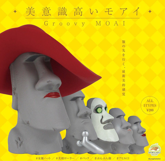 專門推出動漫主題周邊的廠牌Bushiroad creative 與GOODROID,兩大創意品牌公司聯手打造了全新的轉蛋廠牌「鰻魚與哈蜜瓜」(ウナギとメロン),首波推出了超惡搞的爆笑轉蛋「愛美的摩艾像」(美意識高いモアイ)。