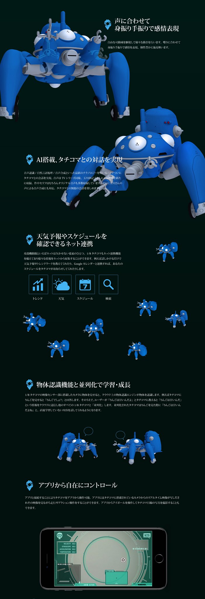 Cerevo 推出的「1/8 塔奇克馬」由動畫系列導演 神山健治監修,以1/8比例再現動畫中的3D模組。「1/8 塔奇克馬」全身搭載了21個馬達,每隻腳的三處關節與車輪、雙手和頭部攝影機都能透過馬達進行高自由度的動作。還能透過手機APP從遠端操控塔奇克馬,不論是移動或攝影都能透過APP達成。