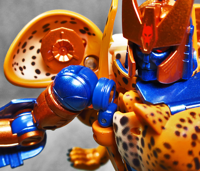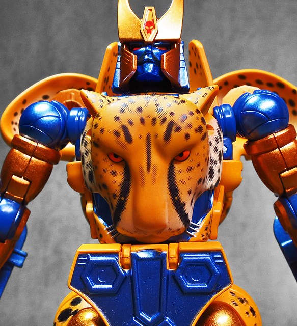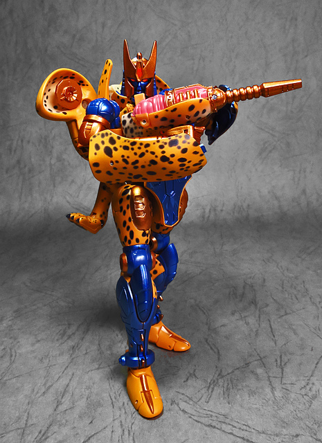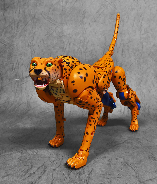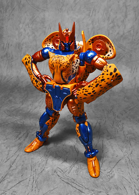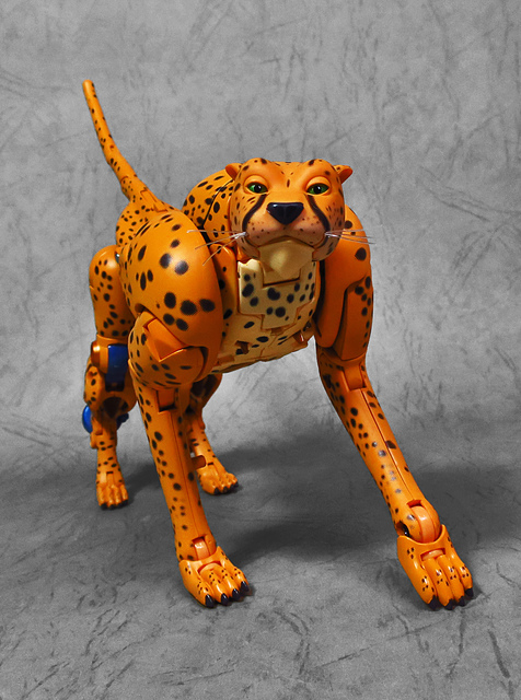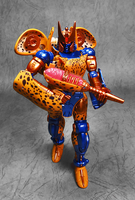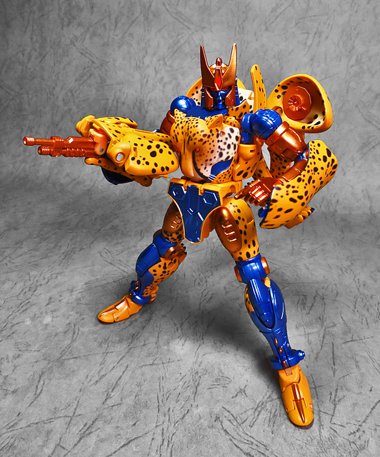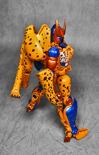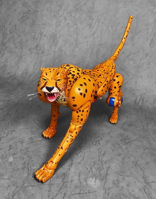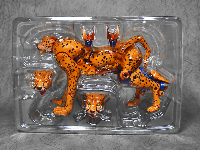 相較於線條方正的交通工具,要將有機生物體的自然輪廓和充滿科幻風的無機機械構造融合為一,難度可說是高了不只一層,除此之外,還要將當年動畫的形象加以再現,對於設計師而言更是一大挑戰,幸好,第一彈的MP金剛王並沒有辜負眾望,這一壯舉也讓玩家們期待更多BW角色的MP化,這回的豹子,自然也成了鎂光燈匯聚的焦點。以現今的技術,動物模式的外型與體態已經是基本要求,實體的表現自然是沒話說,雖然後腳露出的破綻多了些、以印刷重現的豹紋顆粒感重了些,但是該有的可動、替換的三顆豹頭和眼部也都讓人十分激賞,完全將CG動畫中活躍的形象加以重現,變形的過程、則需要一萬分的小心,表面的豹紋、豹頭的鬍鬚、多重又細小的肩關節,最好是謹慎地一步步操作以免悲劇的發生,豹紋皮和金屬藍交錯的機器人模式不僅外觀亮眼,可動也獲得了超大幅度的進化,此外,源自於元祖設計的兩柄槍也完美還原,整體來說絕對是一款值得細細品嘗的絕讚傑作,接下來就請大家慢慢欣賞照片吧!