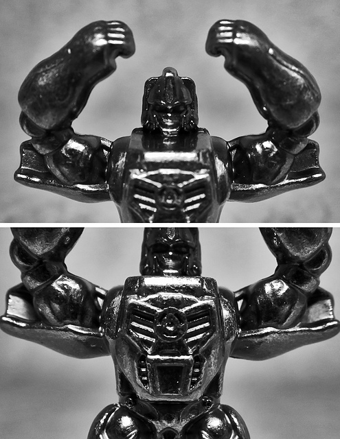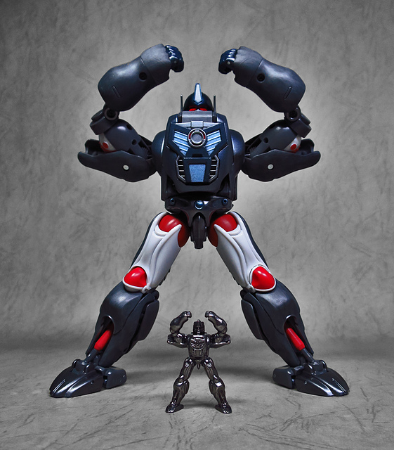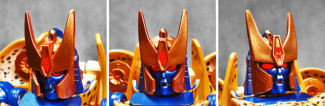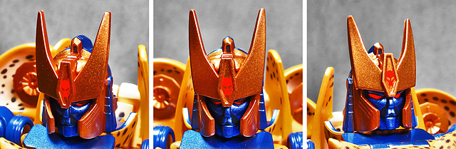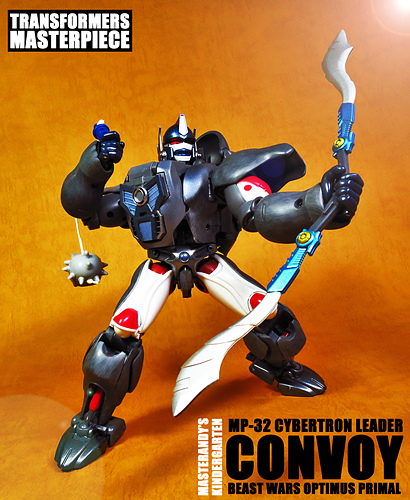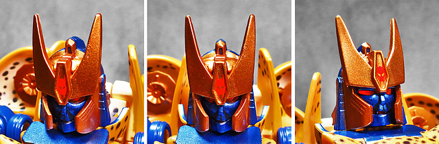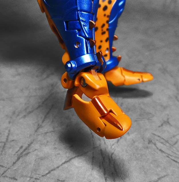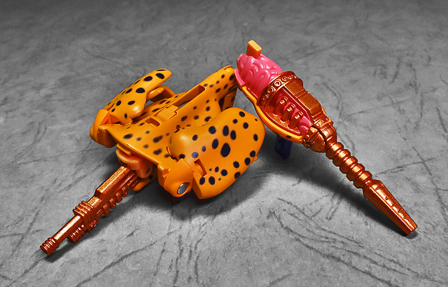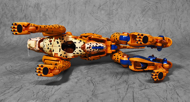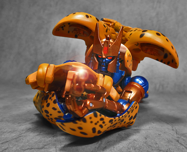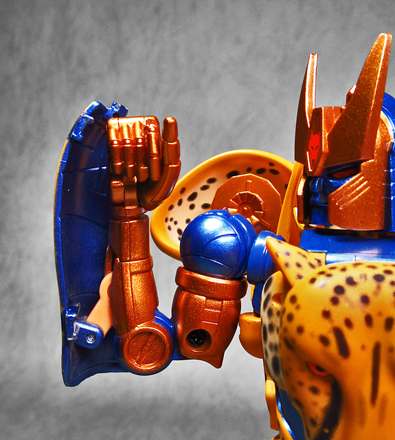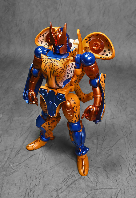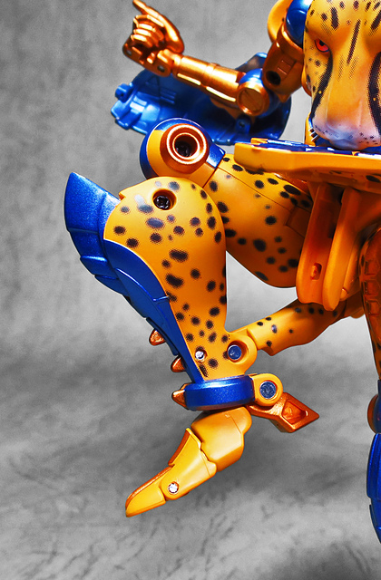 相較於線條方正的交通工具,要將有機生物體的自然輪廓和充滿科幻風的無機機械構造融合為一,難度可說是高了不只一層,除此之外,還要將當年動畫的形象加以再現,對於設計師而言更是一大挑戰,幸好,第一彈的MP金剛王並沒有辜負眾望,這一壯舉也讓玩家們期待更多BW角色的MP化,這回的豹子,自然也成了鎂光燈匯聚的焦點。以現今的技術,動物模式的外型與體態已經是基本要求,實體的表現自然是沒話說,雖然後腳露出的破綻多了些、以印刷重現的豹紋顆粒感重了些,但是該有的可動、替換的三顆豹頭和眼部也都讓人十分激賞,完全將CG動畫中活躍的形象加以重現,變形的過程、則需要一萬分的小心,表面的豹紋、豹頭的鬍鬚、多重又細小的肩關節,最好是謹慎地一步步操作以免悲劇的發生,豹紋皮和金屬藍交錯的機器人模式不僅外觀亮眼,可動也獲得了超大幅度的進化,此外,源自於元祖設計的兩柄槍也完美還原,整體來說絕對是一款值得細細品嘗的絕讚傑作,接下來就請大家慢慢欣賞照片吧!