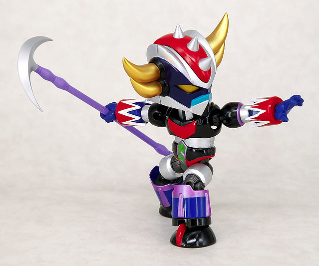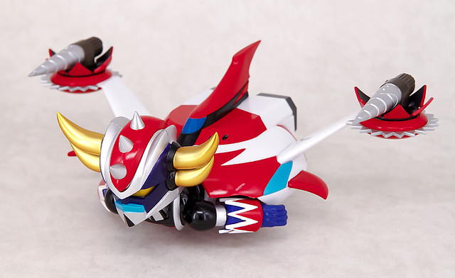 這次還將動畫裡面可以和飛天神機(スペイザー)合體的狀態也完整製作出來,主體克雷飛天神附有可以更換手首配件,螺旋式破碎機手脘配件和武器雙頭鐮刀等等豐富配件,使用複合性材質的"ES合金"系列,在機體部分結構上有「亞鉛合金材質」更增加機械人作品在手上把玩的重量感覺,這次也在眼部配置有Led發光的設計,喜愛《克雷飛天神》動畫作品的玩具人千萬別錯過了啊!