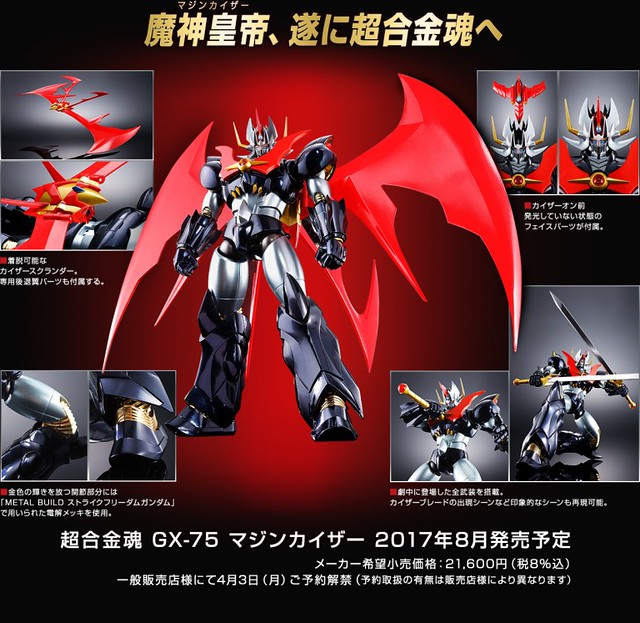 日Bandai萬代玩具公司暢銷熱賣的超合金系列,這次將以《超合金魂計畫20週年》紀念來推出編號GX-75的「魔神凱薩(マジンカイザー)」!之前於"超合金魂計畫20週年"的專書也公開其作品的設計圖繪與素色試作樣品照片,此次魔神凱薩整個比無敵鐵金剛高出有數公分之多,目前先行公開販售資訊。
