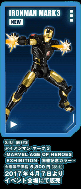 預計於2017年4月7日~6月25日期間將在日本六本木HILLS展望台,舉辦MARVEL/AGE OF HEROES EXHIBITION的展覽,日Bandai萬代玩具公司旗下十分受歡迎的S.H.Figuarts可動系列商品,將在會場推出「鋼鐵人馬克3 MARVEL AGE OF HEROES EXHIBITION 開催記念配色」特殊式樣塗裝的版本(アイアンマン マーク3 -MARVEL AGE OF HEROES EXHIBITION 開催記念カラー)名稱暫譯。