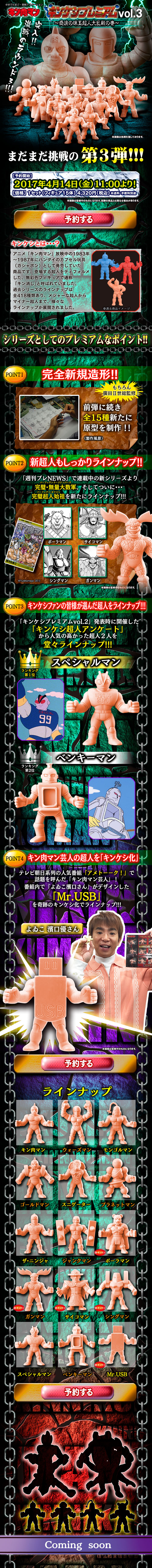 這次一樣把當時懷念的《金肉人》作品裡面所登場的15位角色人物一拳收錄,還把活耀於黃金傳說綜藝節目的日本藝人"濱口 優"放入其宣傳照片當中,因為他也是金肉人作品的粉絲之一,還在朝日節目裡面有著「金肉人藝人(キン肉マン艺人)」的稱號,他所設計「Mr.USB」摔角超人的角色還收錄在這次"第三彈"裡面,這次作品預計在魂web線上商店於2017年4月14日開始接受訂購,對《金肉人》系列作品有興趣的玩具人千萬別錯過了啊!