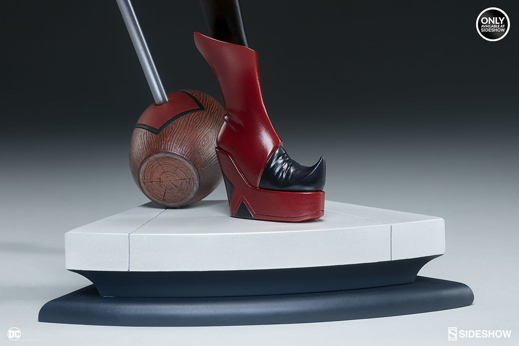 這次的作品以漫畫版的小丑女為基底,但在Artgerm獨具巧思的設計功力下,有著非常獨特調性,紅、黑的經典搭配,彎曲的尖頭高跟鞋,皮革感十足的披肩;原先有種搞笑感的戲服,變成一種具備時裝格調的裝扮!拿著巨大的槌子,露出一臉壞笑,彷彿是正要從後面踢你一腳的瞬間!啊嘶~~散發一種無法抵抗的邪惡魅力!相信身為御姐控的玩具人們一定會爭相搶購的啊