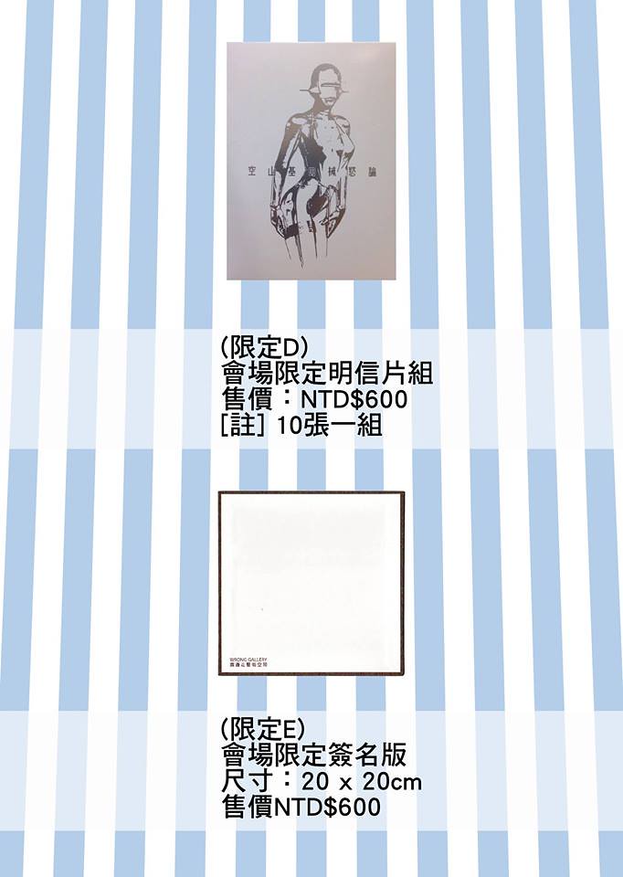 2.簽名會當天將提供"會場限定簽名套組(內含展場專用簽名板 價值 NTD$ ) “以及"會場限量商品"販售,簽名以會場商品3件為限。(個人收藏品可帶1件給老師簽名,限正版商品)
