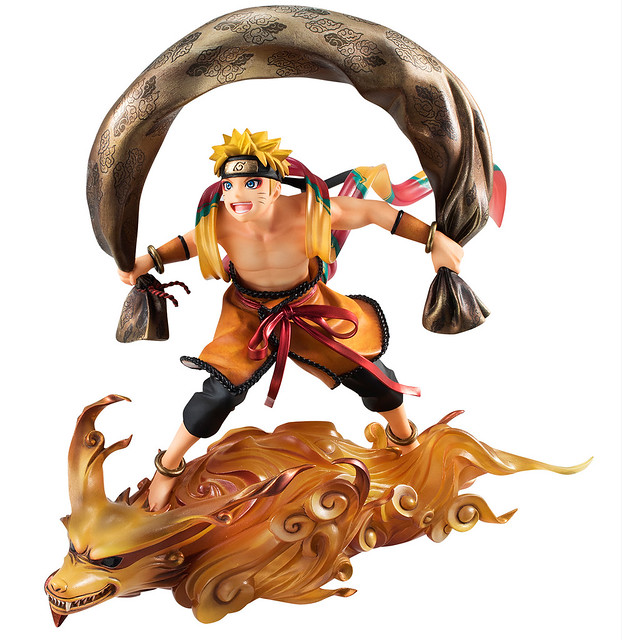 『風神 漩渦鳴人』將以鳴人特色的開朗活潑神情立體化,搭乘著以寄宿於體內的尾獸「九喇嘛(クラマ)」造型概念設計的橘黃色雲朵上。 雙手捉著繪製的美麗雲彩圖樣的金色風帶,赤裸的上身纏繞著橘黃色帶子,生動飄逸又充滿躍動感的姿態完全忠實地立體化。 本作將能夠搭配同步發行的“雷神 宇智波佐助”搭配出日本經典的《風神雷神圖》。