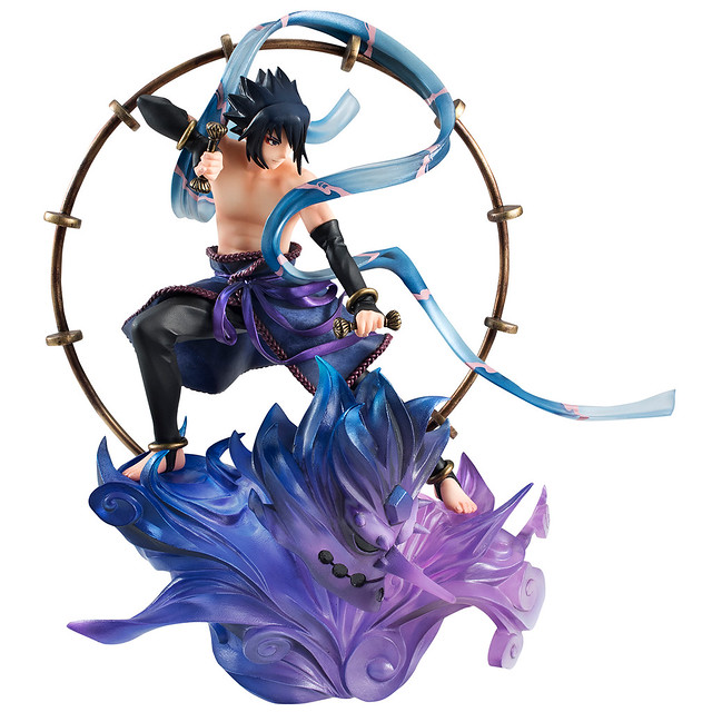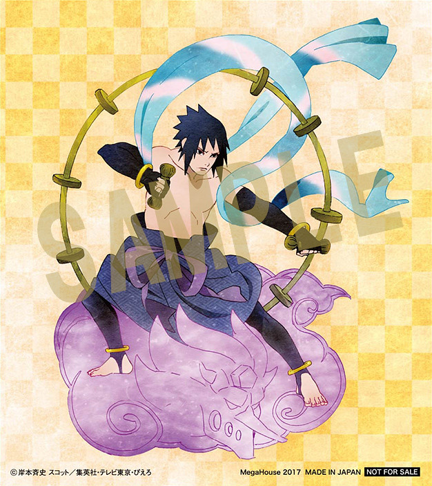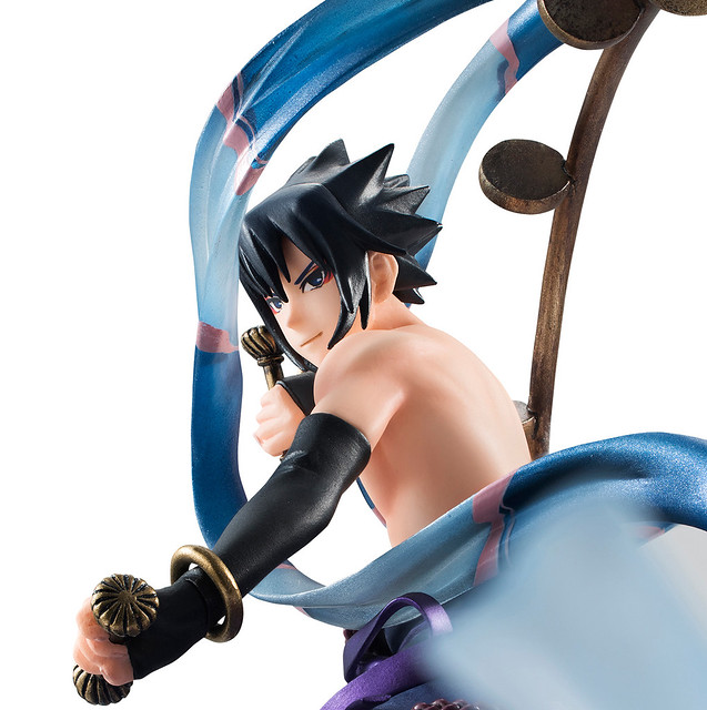 『雷神 宇智波佐助』,讓佐助站立於其得意忍術、召喚出巨大的骸骨造型戰士的「須佐能乎(スサノオ)」為概念設計的紫色雲朵之上。 將以細緻且生動的形式,刻畫出佐助嚴肅的神情、背負著雷神極具個人識別性的雷鼓,與赤裸的上身纏繞著藍色的帶子,與鳴人形成強烈的對比。本作將能夠搭配同步發行的“風神 漩渦鳴人”搭配出日本經典的《風神雷神圖》。