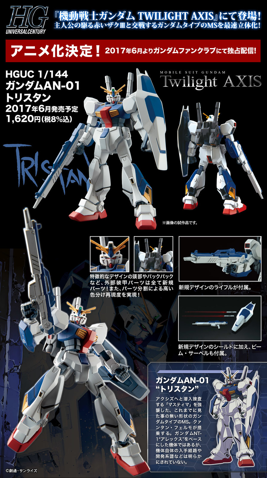 近日《機動戰士鋼彈 Twilight AXIS》小說作品將改編成動畫,劇情背景設定在宇宙世紀0096年也就是《機動戰士鋼彈 UC (Gundam Unicorn)》幾個月後所發生的故事,動畫作品才預計將於2017年6月推出,廠商近日立馬公開其HG系列的主役機體「鋼彈AN-01 崔斯坦(ガンダムAN-01 トリスタン)」(名稱暫譯)。