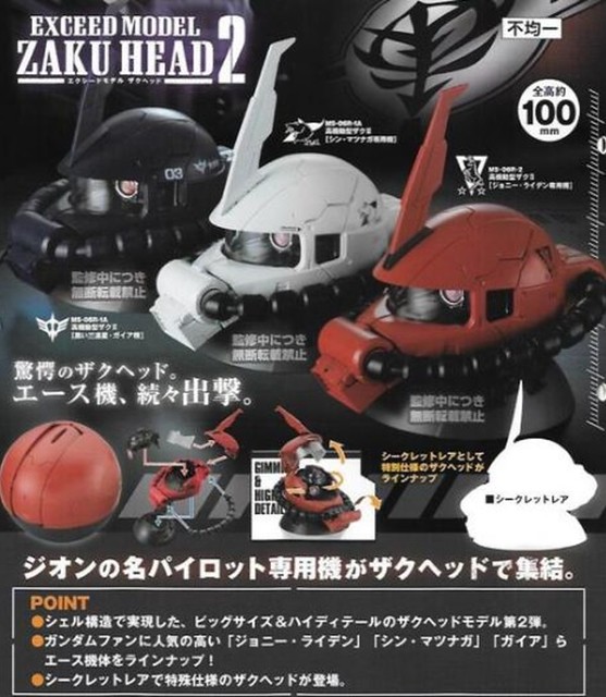 由日本 BANDAI 玩具公司轉蛋事業部發行,有著超越轉蛋水準的精密細節,甫推出就熱賣到處處缺貨的「EXCEED MODEL ZAKU HEAD」薩克頭像,日前發表了第二彈商品「機動戰士鋼彈 EXCEED MODEL ZAKU HEAD 2」預計於 2017 年 08 月發售的消息,參考售價各 500 日圓。