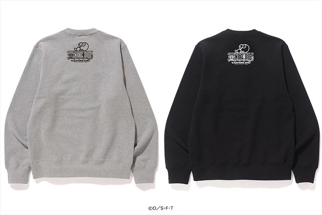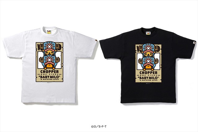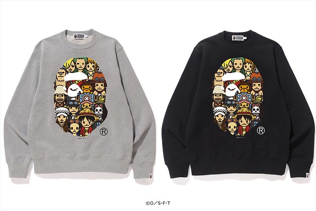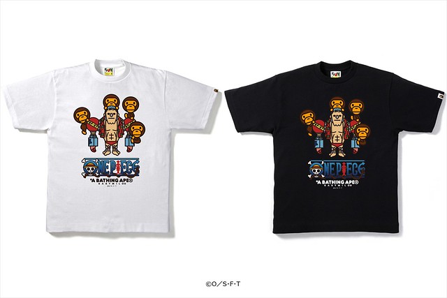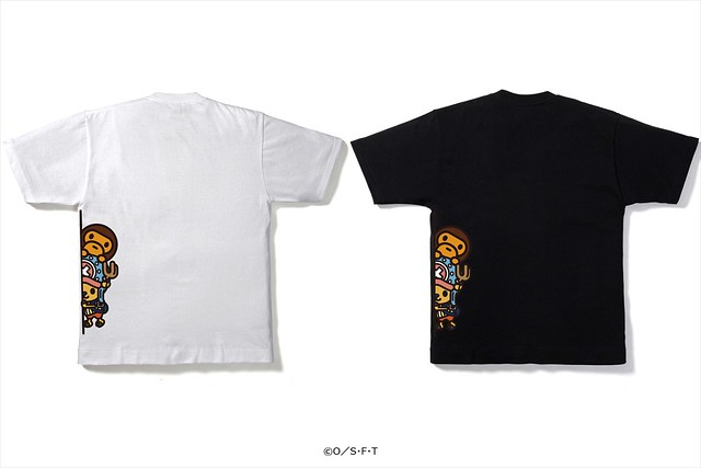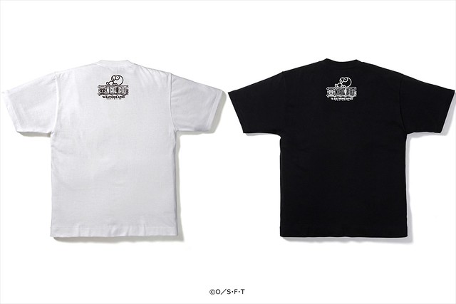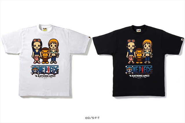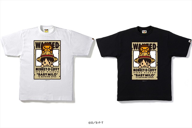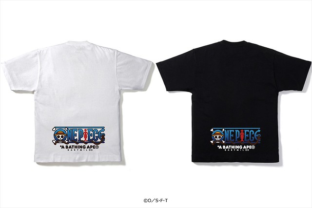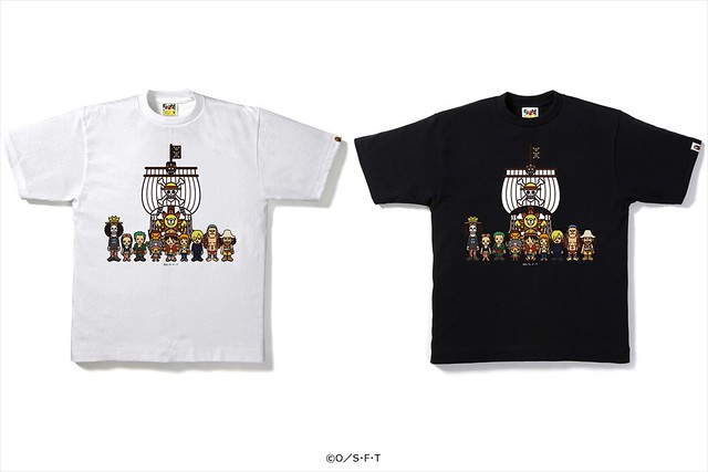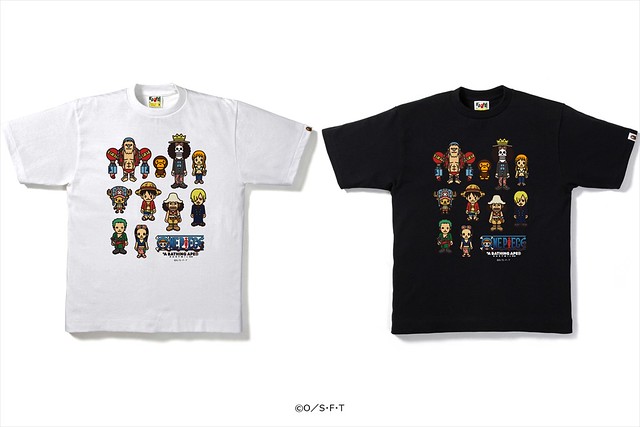 這次A BATHING APE® 與海賊王雙方的聯名合作,目前看來預計推出十七款不同樣式的長、短袖T 恤啊!這系列的服飾將以A BATHING APE® 最討人喜愛的Baby Milo、猿人頭像搭配著海賊王經典的角色,包含蒙其.D.魯夫、波特卡斯.D.艾斯、薩波、多尼多尼.喬巴、娜美、妮可.羅賓、佛朗基等角色為最主要的設計風格,每款圖樣將會同時推出黑、白兩色的T恤,並且另有大集合的款式。