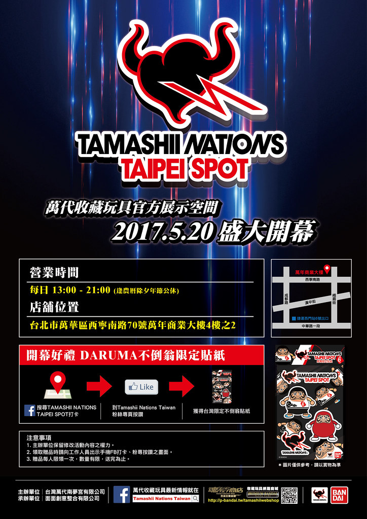 萬代收藏玩具事業部 (https://www.facebook.com/tamashiiFanclub)官方展示空間【TAMASHII NATIONS TAIPEI SPOT】將於2017年5月20日(六)於台北西門町萬年大樓4F正式開幕。場內將會展示萬代玩具收藏玩具事業部旗下各大品牌的商品,未來也會不定期推出各式主題展覽,除了可以近距離欣賞豐富的展品,在展示空間內還特別設置了「試玩區」,可讓來場者動手把玩、親自體驗商品魅力。