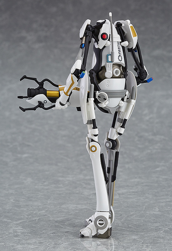 「figma P-Body」全身有著相當細膩的骨架、管線等構造,相較於 Atlas 更為修長苗條,背部印有「Aperture Science 公司」logo,以及金屬色塗裝的內構。整體可動也相當出色,透過可動式的眼睛(攝影機)和替換式的護蓋,就能再現各式各樣的表情,各關節週邊的部位也使用軟材質製成,減少可動干涉。本體還能脫離四肢,直接在地上滾來滾去喔!配件則附有必備的「傳送槍」。