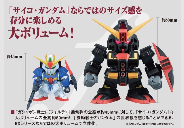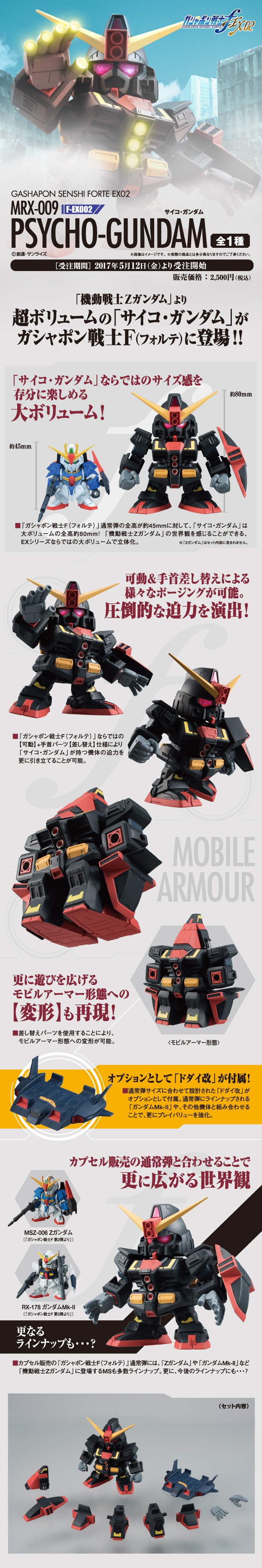日Bandai萬代玩具公司的轉蛋事業部門其"轉蛋戰士(ガシャポン戦士)"系列十分受好評,將以"非常"的嶄新系列「F(フォルテ)=強く」(名稱暫譯)來推出!強調機體的"武裝大型化"以及手首可以替換、或是機體的新可動關節的進化等等,首波已經公開「第一彈」、「第二彈」與「第三彈」以及"特別彈(EX01)"的「潘尼洛普」後,近日再公開了將繼續推出"特別彈(EX02)"的「感應鋼彈(サイコガンダム)!