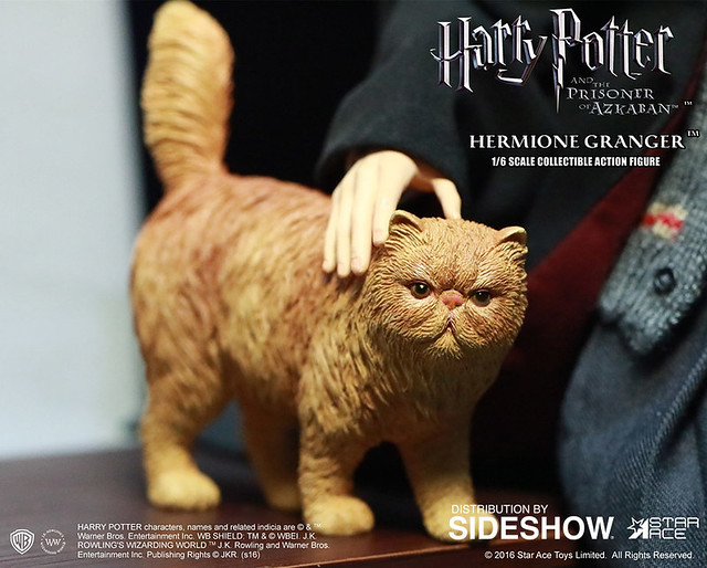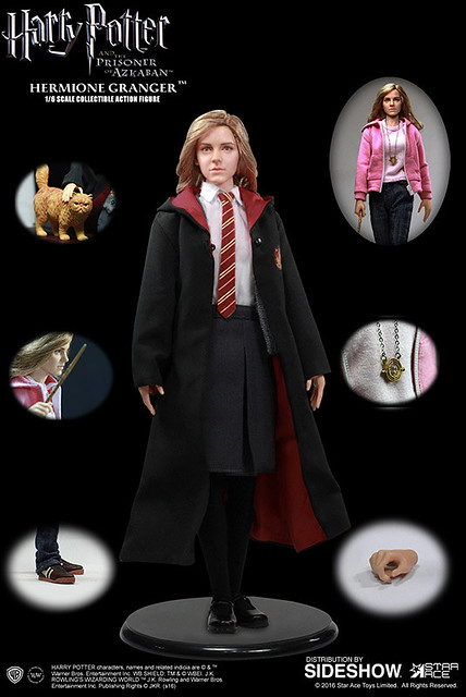這次的「妙麗」採1/6 比例,大約29公分高,全身有30處可動關節,除了有學院制服外,還附上粉紅色上衣、外套及牛仔褲的便服,配件部分則包含魔杖(Wand)、時光器(Time turner),非常的細緻;寵物貓「歪腿」一定令許多人眼睛為之一亮吧,真的很可愛啊~頭雕也頗有當時艾瑪·華森略微青澀的神韻呢!