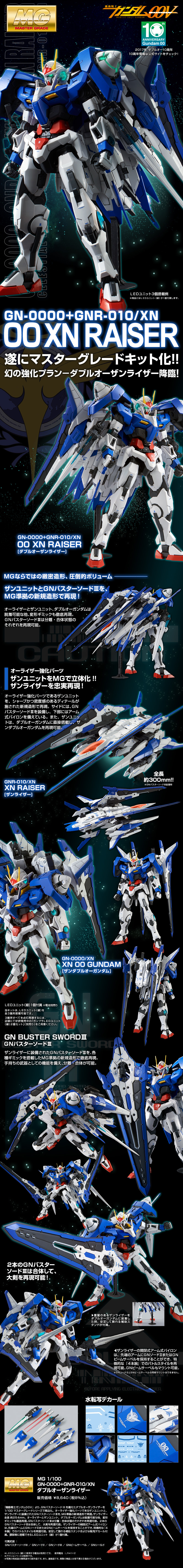 持續進行中的「機動戰士鋼彈 00 十週年計畫」又推出新商品了!日本BANDAI萬代玩具公司發表了旗下鋼普拉「MG(Master Grade)」系列最新商品,來自《機動戰士鋼彈00V》的「MG 1/100 00斬擊強化模組(00 XN Raiser)」預計於 2017 年 07 月發售的消息,參考售價 8,640 日圓。