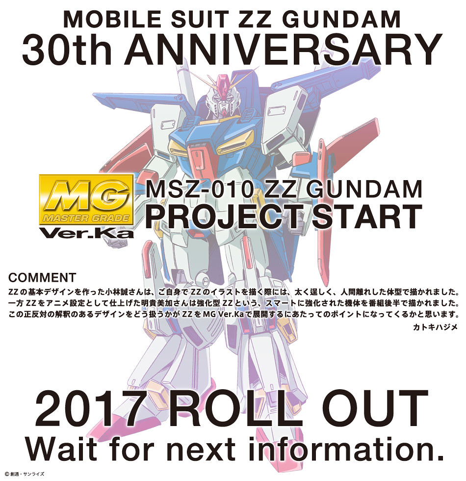 本年度最讓人期待的鋼普拉大作「MG 1/100 ZZ鋼彈 Ver.Ka」最新情報公開!日本BANDAI萬代玩具公司於今日舉行的「Shizuoka Hobby Show 2017」中展出了「MG 1/100 ZZ鋼彈 Ver.Ka」的試作品灰模,同時也公佈預計於 2017 年 09 月發售的消息,參考售價 6,480 日圓。