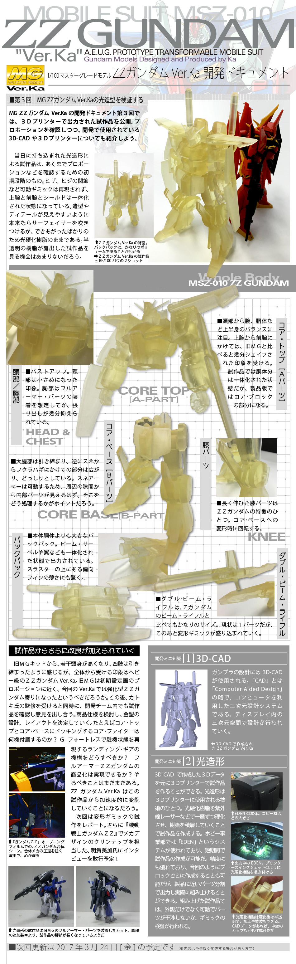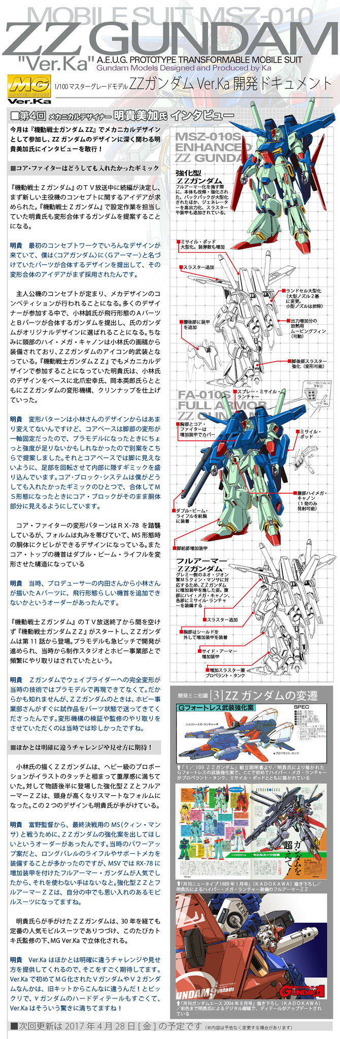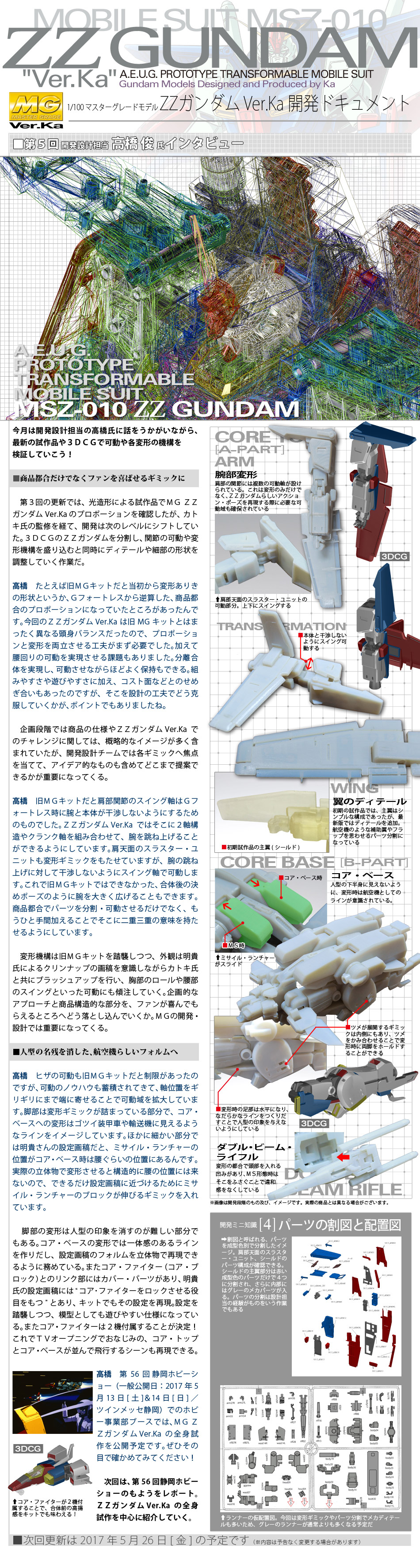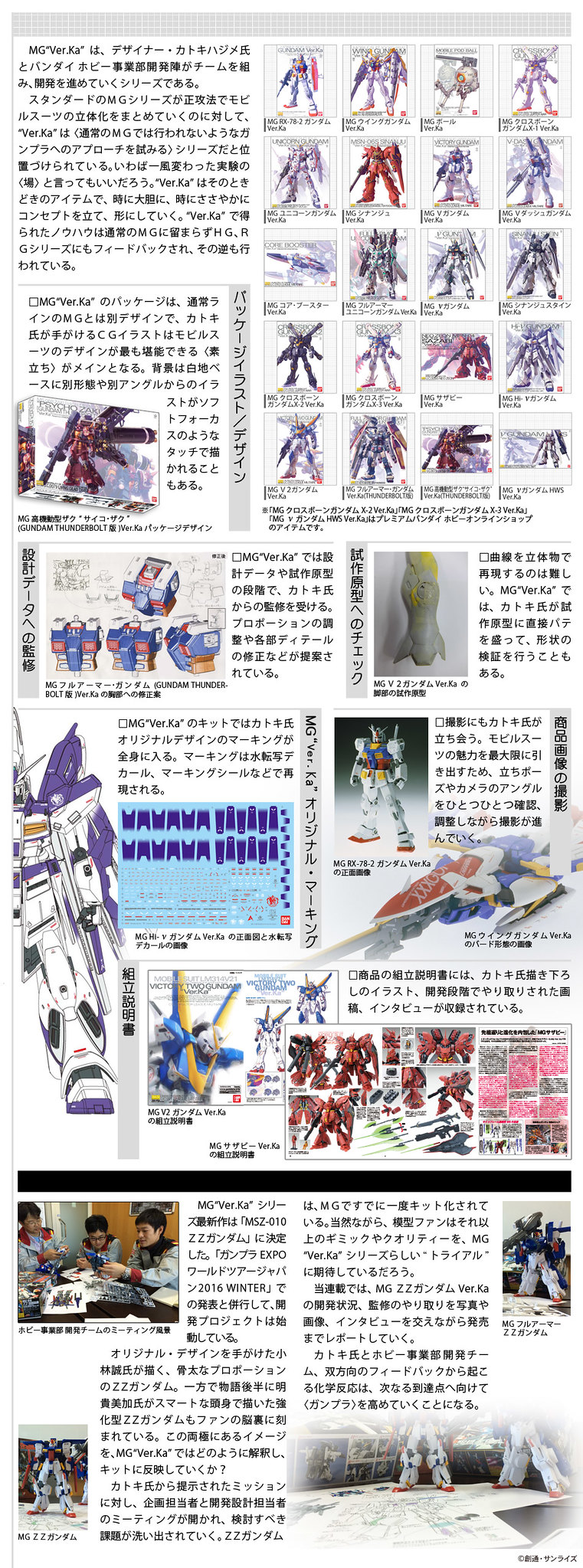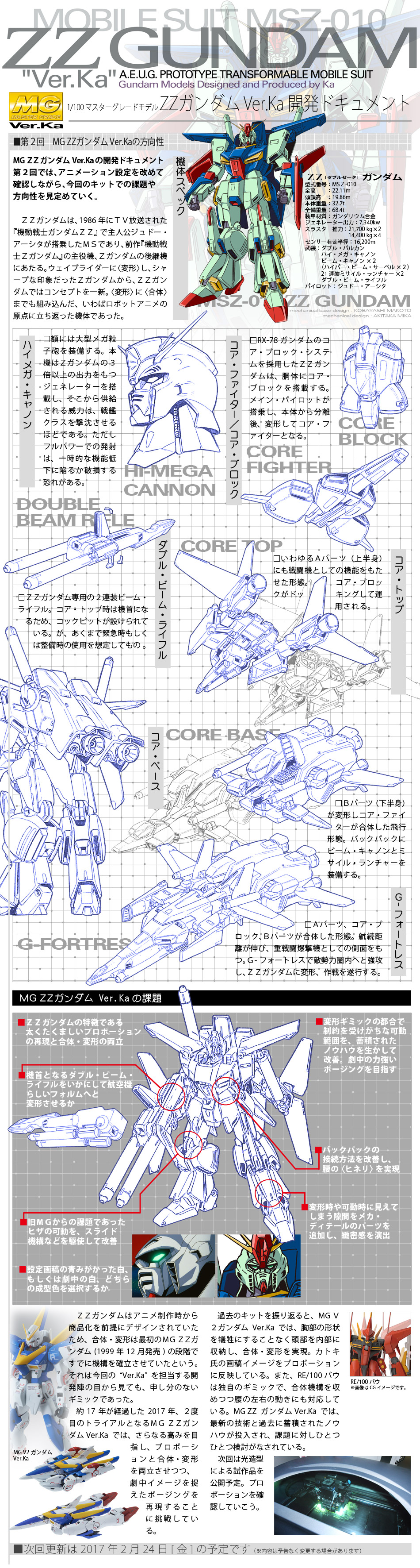 「MG 1/100 ZZ鋼彈 Ver.Ka」雖然掛著 Ver.Ka 這項招牌,但其實是集結了 角木肇、明貴美加、高橋 俊 眾人之力的超大作。承襲了舊 MG 套件的變形機構並且打造出全新的外觀造型,透過複雜的分件與機構將各部件的可動干涉降至最低,再現「合體.變形」機能,同時也保有胸部與腰部的可動性,複雜程度可能堪比當年的「MG Ex-S鋼彈」!