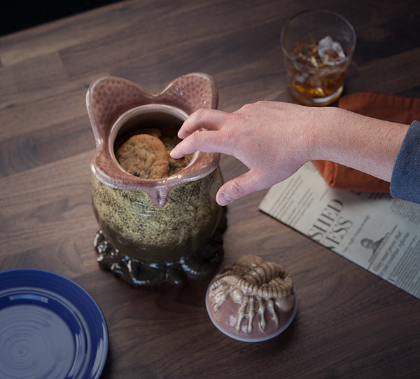 在《異形》的系列電影中,超噁心的異形蛋(Ovomorph Egg)在偵測到生命體靠近之後,會以超快速度射出「抱臉體」( facehugger),纏繞著靠近的可憐蟲並且把卵送進生物體內,非常可怕啊~由於這次的作品是異形蛋已經打開的樣子,所以把抱臉體當成餅乾罐的蓋子,這樣的惡趣味真的太吸引人了~絕對是異形迷們吃零食的超棒(?)收納小物啊!