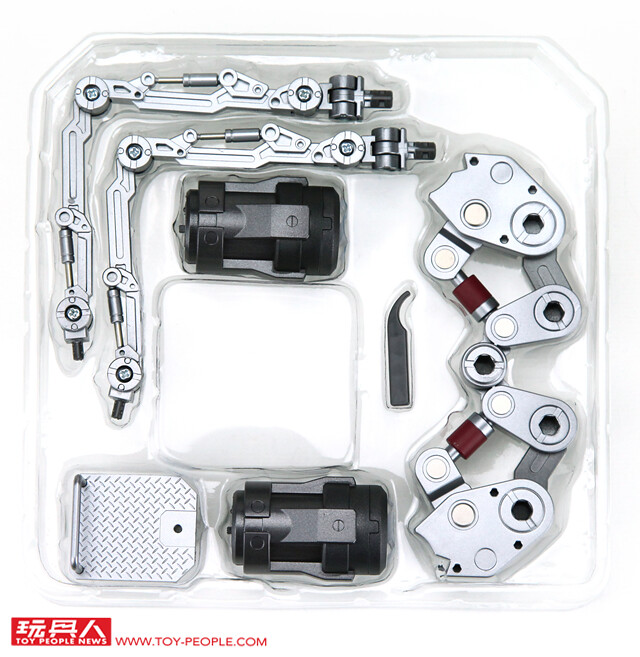 ▼ 包裝內容。 為了節省空間與成本,所以使用自行組裝右肩甲的縮小包裝。另外,為了避免刮傷,很多零件重疊的部位也置入了塑膠片用以避免磨損,相當用心的包裝。