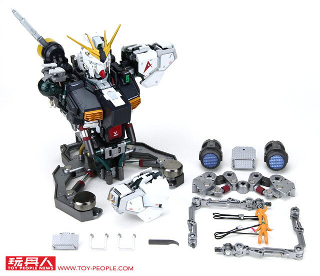 ▼ 商品內容物一覽:ν鋼彈本體、整備平台×2、太空服維修員×2、合金支架×2、燈具底座、燈具支架×2、燈具×2以及一隻取出水銀電池專用的輔助工具。