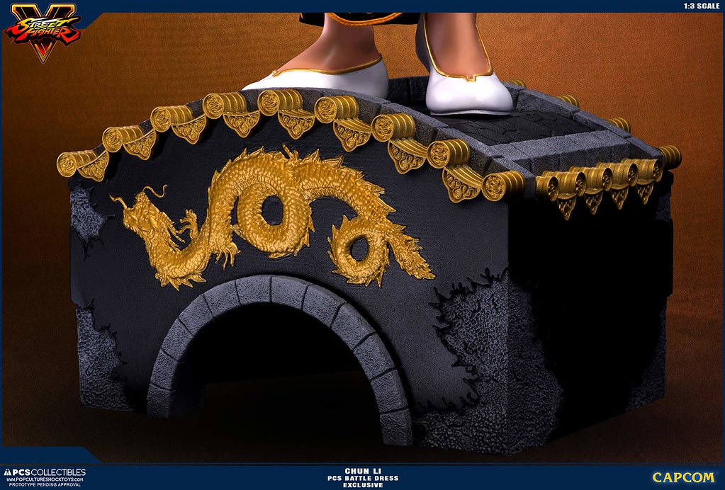 這次的作品以《快打旋風5》登場的新造型為主題,先前一襲青色旗袍改為黑黃色,腰間還系著紅色中國結,原先的包子頭也變成秀麗長髮造型(長髮控歡呼~),鑲著金龍的地台更是瀰漫著濃厚的中國風;沒什麼遮擋功用的旗袍戰鬥服、結實粗壯的肌肉搭配火辣性感的身材,超激烈的視覺衝擊絕對是春麗粉的極致收藏啊~~