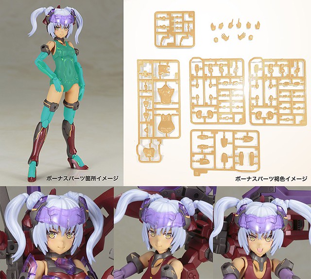 商品中包含了鮮紅魔鷲的特色武裝「Beryl ShotRifle(ベリルショット・ライフル)」四把,也附上了上色完成的表情3種+未印刷1種、PVC製造型手掌,能配合不同的場景使用。素體上的孔皆為3mm,可與已發售的「骨裝機娘」、「骨裝機兵」等系列互換零件。這次還多了Bonus零件,能將素體替換成與膚色相同的褐色!