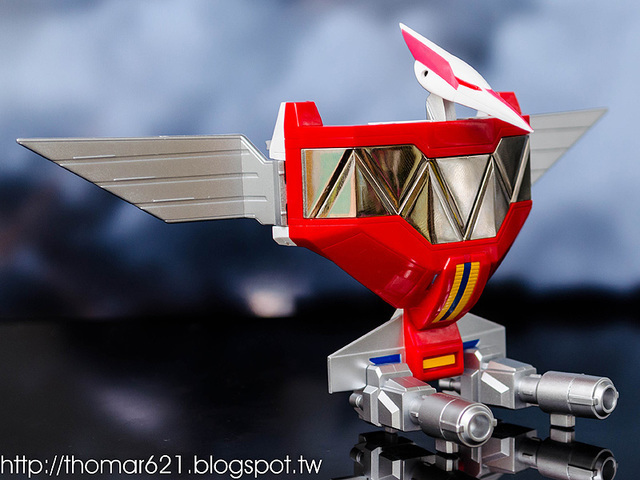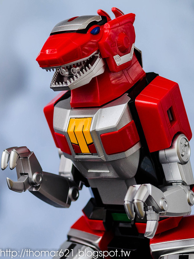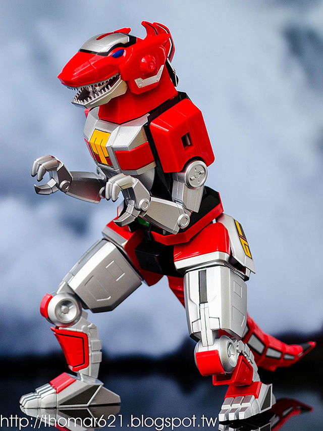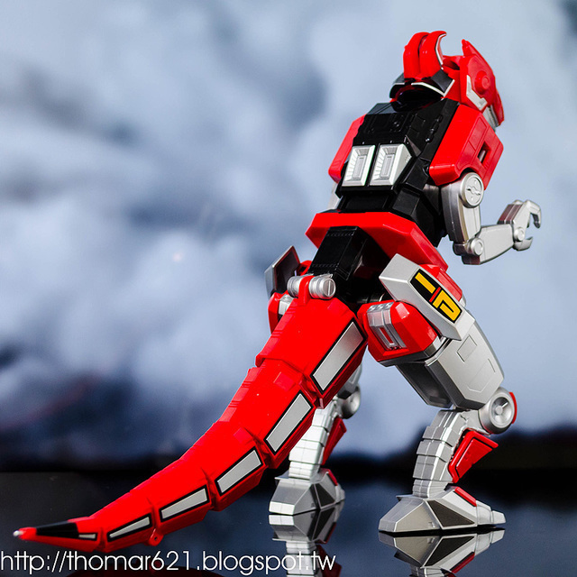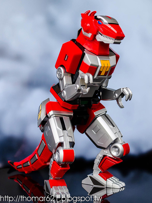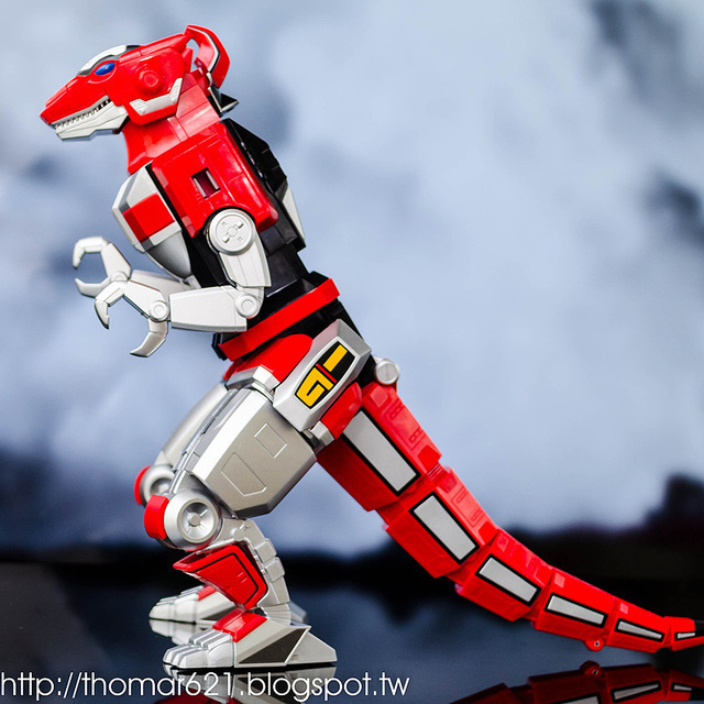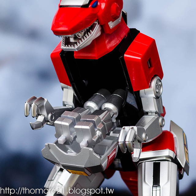 霸王龍-紅色暴龍,合體部位為軀幹跟頭部,嘴巴張開不再是貼紙的衝擊砲了,膝蓋的合體卡榫也可以藏在小腿內側。手指可動,有腰關跟大腿水平關,算是5隻裡面動作擺弄最靈活的一隻,胸口一樣可以藏翼手龍的武器。