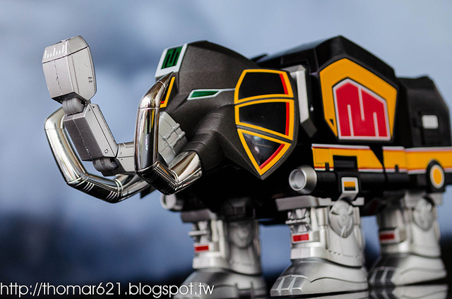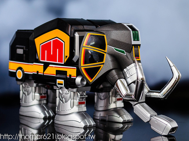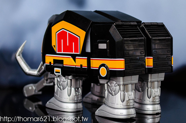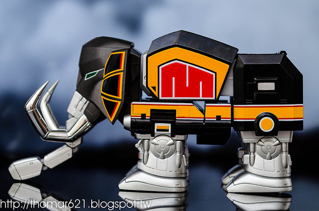 猛瑪象-黑色大象,合體部位為雙手及背包,頭部為盾牌。肩甲有多設計了多片可摺疊的黑色擋板,讓後腿的手臂零件不再外露。長鼻可動、頭部可上仰。