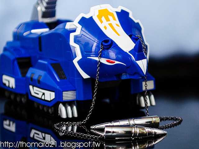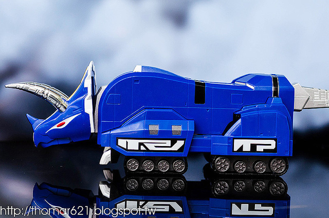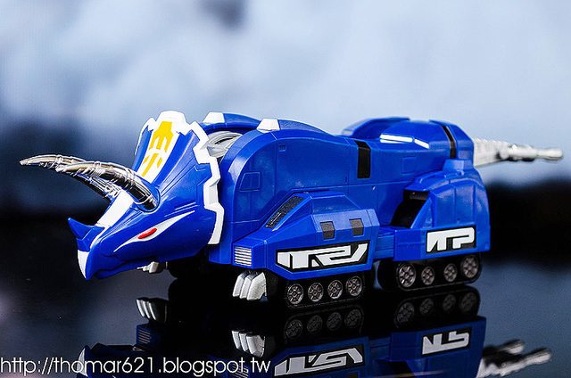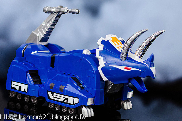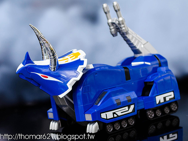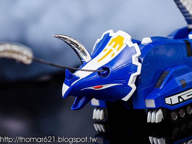 三角龍-藍色三角龍。合體部位為左腳,兩隻龍角內有藏鐵鍊,不過底部沒有輪子可以轉了。頸部可動小靈活,嘴巴可開闔。