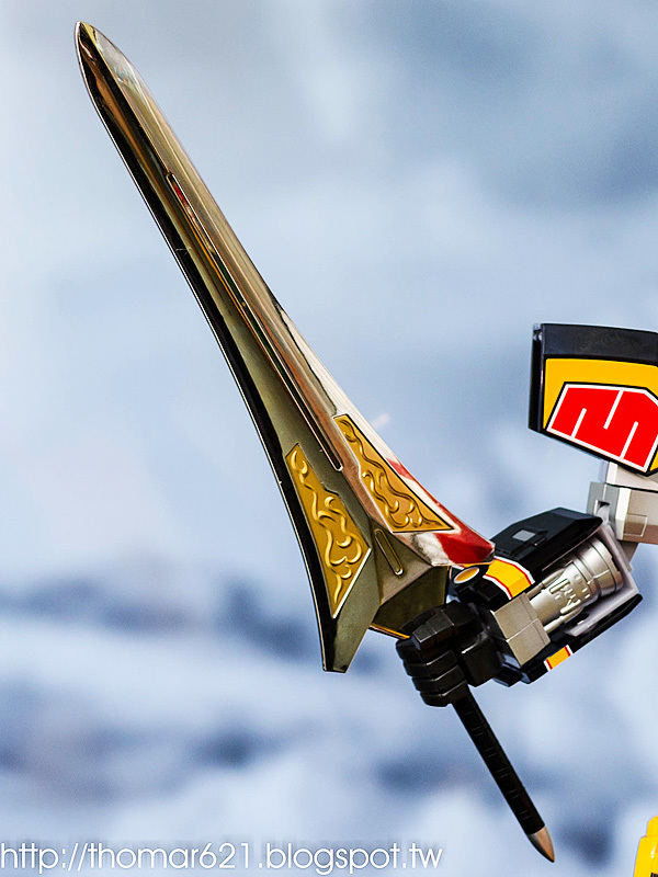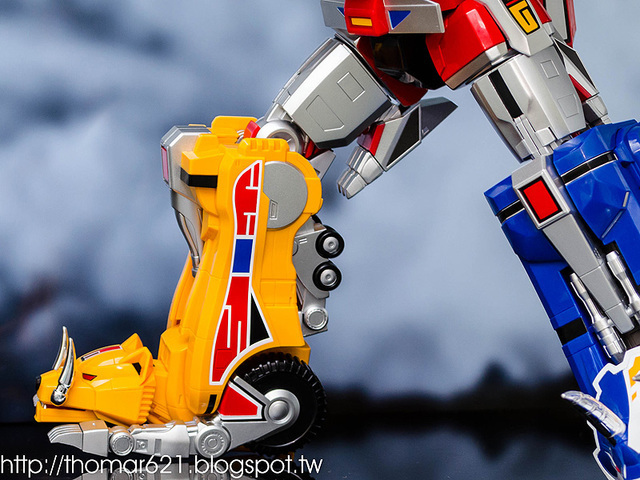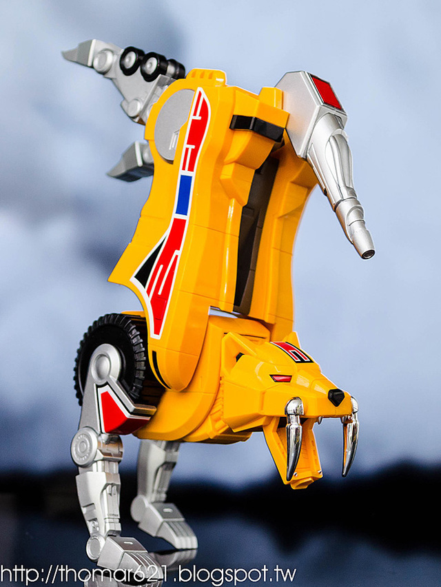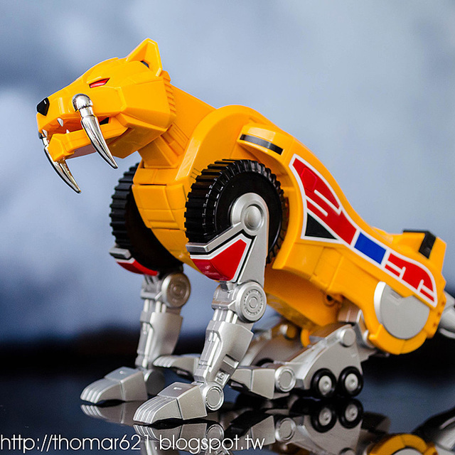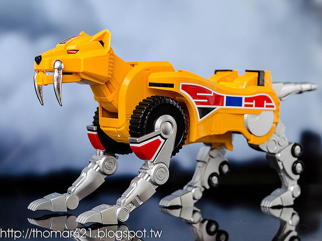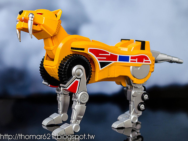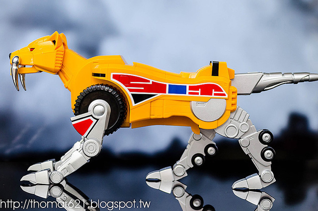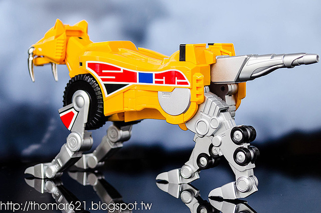 劍齒虎-黃色劍齒虎,合體部位為右腳,輪子的部位不能轉了,四肢都有增設關節,頸部可小活動,玩起來5隻裡面動作第二靈活的。因為動物朋友的關係這隻我拍的很すごーい!拍完照我才發現尾巴可以伸縮...