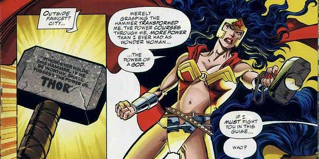 在 90 年代推出的漫威大戰DC的漫畫中,神力女超人被認定有資格可以拿起雷神之錘,這點其實很重要。因為在神力女超人之前都是平行世界,或者有法術搞鬼才會讓女性拿起錘子,但只有神力女超人是第一個實實在在且被正史故事所承認的雷神之錘女性持有者。