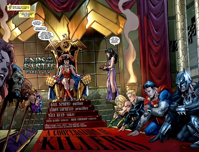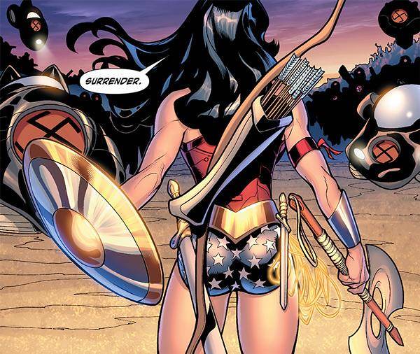 為了諷刺男性霸權與女後宮的歷史,近代漫畫有一回就設定在一個神力女超人為霸王的假想現實中,裡面的劇情設定上跟跟神力女超人甚至是整個DC宇宙有關的惡棍都被斬首,其頭部像戰利品般放在皇宮裡,而跟神力女超人有曖昧,甚至是好友的男性角色,都成了神力女超人的後宮兼親衛隊~