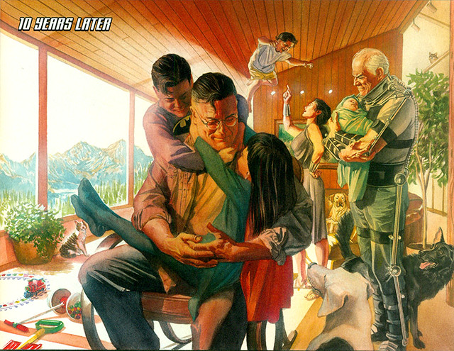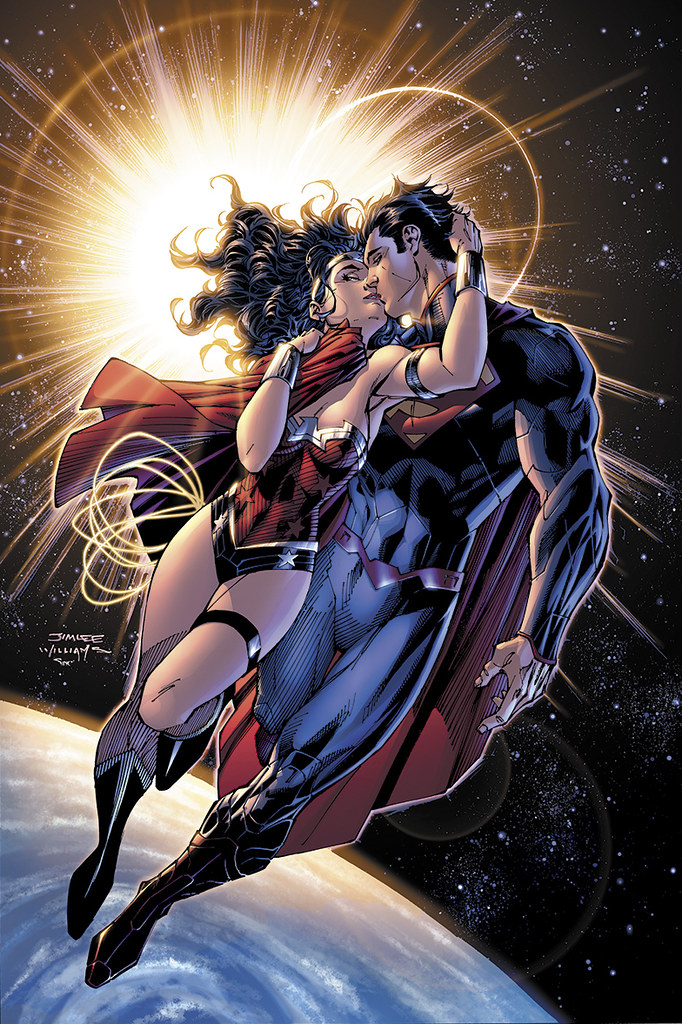 當然另一個好友-超人也是會被當作談感情的對象,不過這通常是劇情設定為路易絲死掉,或者超人沒跟路易絲在一起的情況下,兩人才會結成連理。而跟蝙蝠俠比起來,跟超人在一起也凸顯比較多議題,如超人類間的結合是否會造成人民恐慌,或者是美國第一男英雄跟第一女英雄在一起的性平權議題...等;兩位漫畫界的傳奇人物都分別曾繪製此主題,圖1是由Jim Lee,圖2則是Alex Ross。