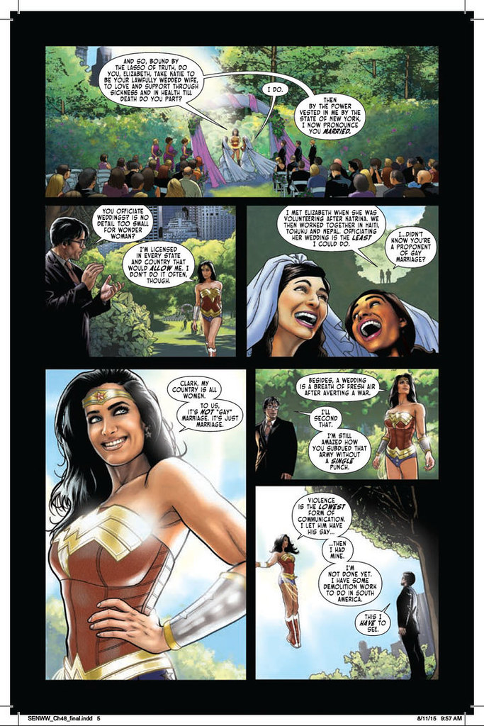 雖然早就有LGBTQ英雄的存在,甚至在美國憲法同意前,許多LGBTQ虛構角色在影集、漫畫、小說、電玩上都開始結婚,可是沒有角色主持過LGBTQ婚禮。直到2015年,神力女超人成為第一個主持LGBTQ婚禮的英雄,象徵著神力女超人的主要精神之一,也就是愛為平等的主旨。