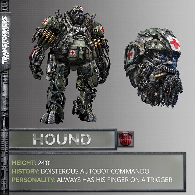 -「探長」(Hound):在《絕跡重生》的激烈惡戰中熱血突圍的博派沙場老將,本集也將接替前任醫官飛輪的醫護工作,身兼二職的探長將會有什麼精彩的表現呢?就讓我們在電影中見真章吧!