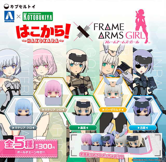 除了發行自家商品,壽屋也與日本青島文化教材社合作,推出《Frame Arms Girl 骨裝機娘》轉蛋商品「~HAKOKARA~Frame Arms Girl」,商品預計 2017 年 06 月發售,參考售價 300 日圓/轉。