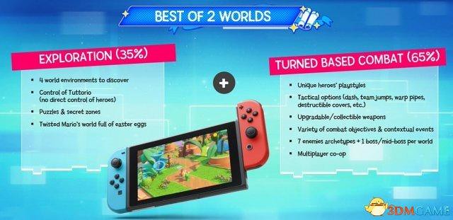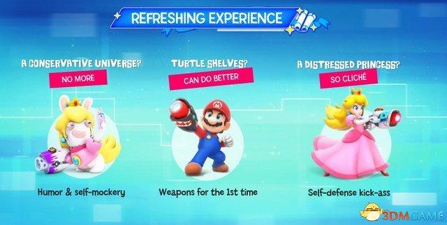 進行遊玩的方式有探索、戰鬥兩個主要部份,其中探索在整個遊戲中約佔35%,而戰鬥部分則是65%,目前知道這款遊戲有8個可以操縱的角色,包含瑪利歐(The Leader)、路易(The Eagle Eye)、碧姬公主(The Badass Princess)、超可愛的耀西(The Explosive Head),還有身穿各種服裝、超級爆笑的瘋狂兔子(Rabbids),擁有各自不同的技能、風格參戰,真的太吸引人了啊~~