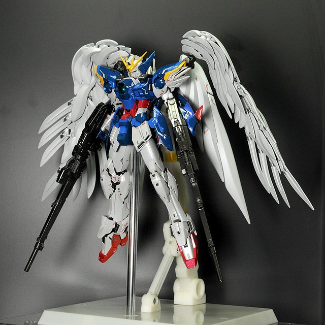有著修長比例的「G.F.F METAL COMPOSITE 飛翼鋼彈零式EW」在最初發表時就打著「feat. METAL BUILD」名號,融入了不少MB系列的造型特色,像是裝甲上豐富的資訊量、多重色塊的藍色外裝甲,以及精緻的金屬色澤塗裝。造型立體的羽毛上還能看見不少可動機構,從官方釋出的剪影圖來看,使用羽翼包覆身體的機能是可以重現的。武裝則附有招牌的雙重破壞步槍。