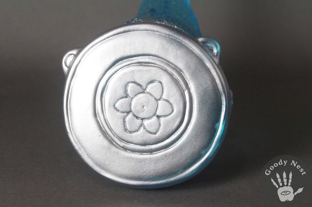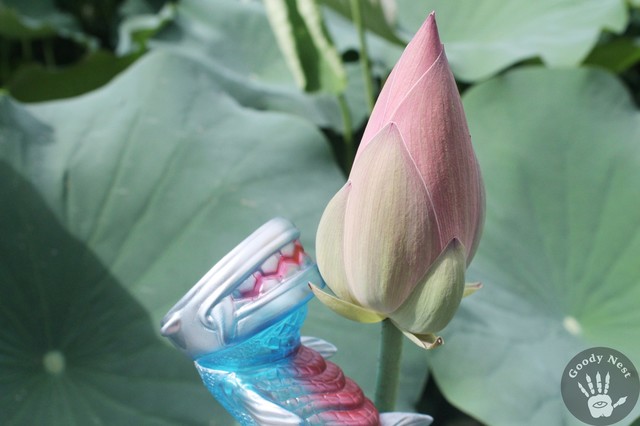 類似罐頭的圓型平面,頭頂平面處刻了一朵小花,就像小孩子的手繪花朵,側面有怪獸的牙齒,以及嘴巴兩側的獠牙,再往側邊看,會發現這隻怪獸竟然還有小耳朵,造型是類似哺乳類的耳,一切一切不合理的設計,成就了這顆荒謬的頭。