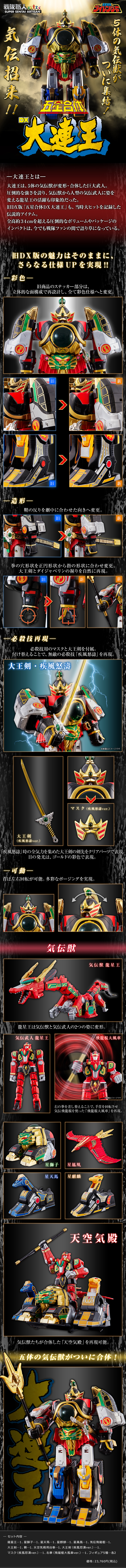 全新的「五星合體 DX大連王」在原本的貼紙部份做了大幅改動,不但全面改為顏料塗裝,面的構成也更為立體。造型部份則將原本反的大王劍劍鞘改正,拳頭握持武器的孔形狀更自然,頭部還能左右轉動。配件中附有必殺技用的面罩與金色大王劍,能夠重現無敵的必殺技「疾風怒濤」!透過專用台車,五隻氣傳獸更能組成飛行型態「天空氣殿」!