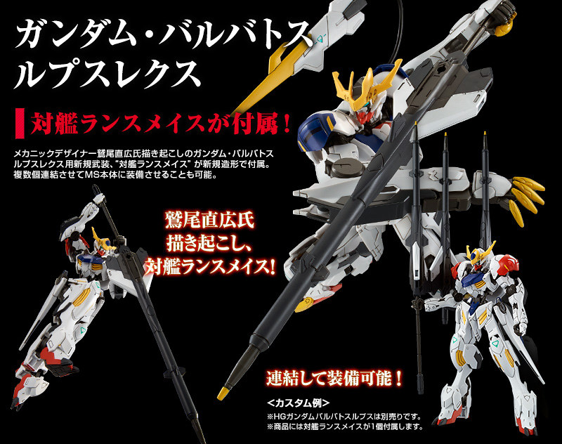 之前這四款作品在「HG系列」都已經個別推出過了,所以這次廠商特別在部份武裝、配件上以新規造型來刺激買氣!此次「天狼王型獵魔鋼彈」除了"大型錘矛"外多附有新規武裝鷲尾直広所繪製的"反艦飛彈(対艦ランスメイス)",並且可以數個連接於機體背部攜帶,「智魔鋼彈重鍛開鋒型」則是長距離飛行所使用的"支援背包(バックパックユニット)"以新規造型呈現,另外「蔽魔鋼彈(流星號)」多附有「大型攻擊彈頭(大型ダインスレイヴ弾頭)」的新規武裝等等。