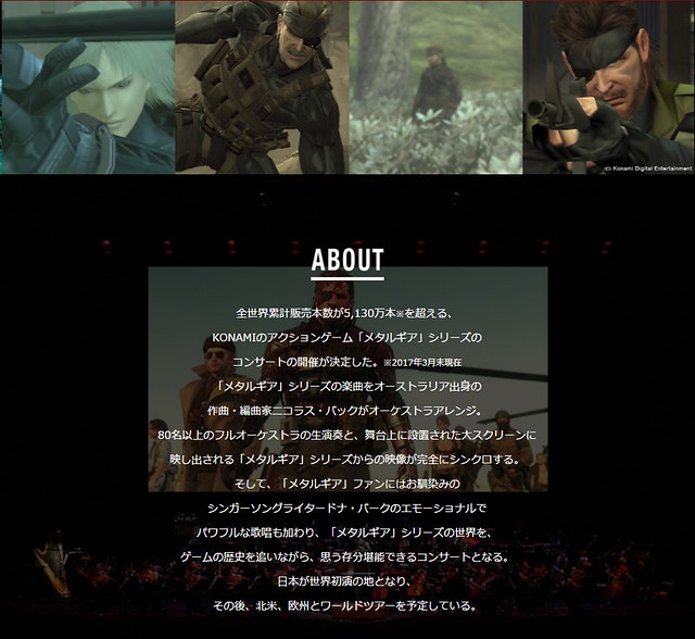 「METAL GEAR IN CONCERT」預定於 2017 年 07 月 30 日、08 月 02 日分別於日本大阪、東京進行公演,LAWSON 將在台灣時間06 月 02 日 17 時~ 13日 22 時 59 分先行售票,售價 9,500 日圓(全指定席)。