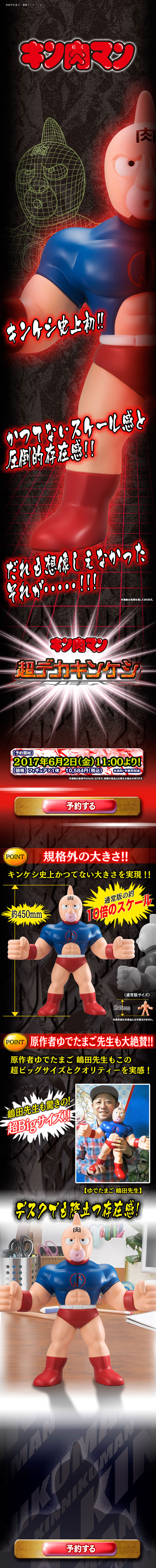 還特別請來原漫畫作者"嶋田隆司"參於宣傳照片的拍攝,連老師都十分驚訝的巨大尺寸,金肉人作者的名稱之前在台灣地區都翻成為"蚵仔煎"老師,而"蚵仔煎"其實是一個日本漫畫家二人組的共用筆名,成員包括編劇"嶋田隆司"和作畫"中井義則",嶋田老師"嶋"的注音是ㄉㄠˇ,這個作品材質官網公開為PVC的塑膠材質而不是橡皮擦(消しゴム)材質的,不過造型與姿勢完全是"角色橡皮擦"系列的放大版本,預計在魂web線上商店於2017年6月2日開始接受訂購,對《金肉人》系列作有興趣的玩具人千萬別錯過了啊!