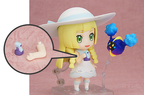 「黏土人 莉莉艾」以遊戲中的形象為基礎製作,身穿可愛的白色洋裝以及可脫卸下來的大遮陽帽,備有「普通臉」、「笑臉」、「生澀笑臉」等多種表情,能夠充分感受到遊戲版莉莉艾的魅力!配件中還附有精靈球造型的「圓筒包」以及被她稱作小星雲的寶可夢「科斯莫古」,配合多種手腳造型零件就能再現他們親密互動的場景喔!