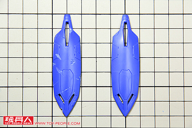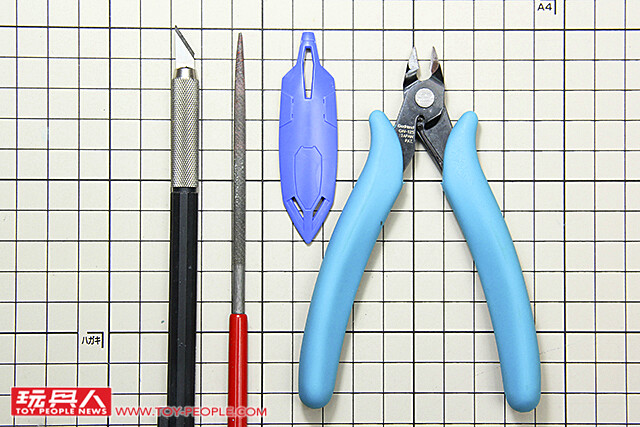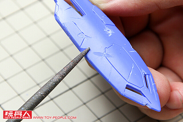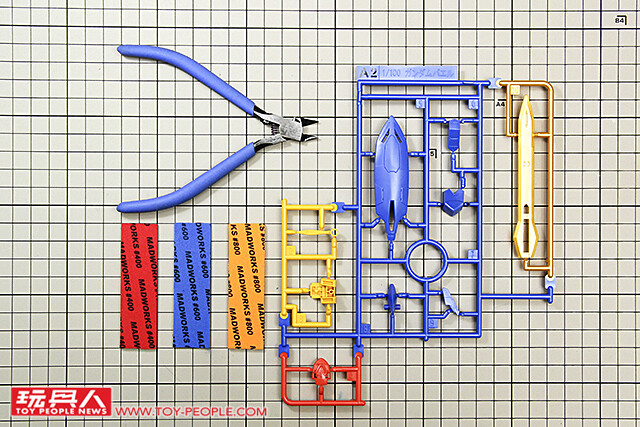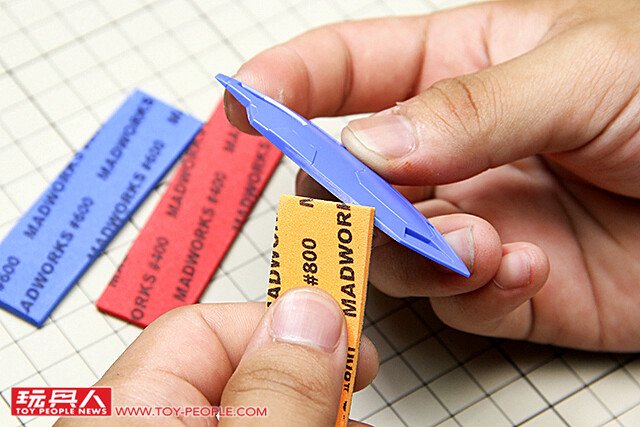 ▼ 使用斜口鉗修剪掉湯口之後,拿出準備好的砂紙,從400~800依序將湯口的瑕疵研磨去除。